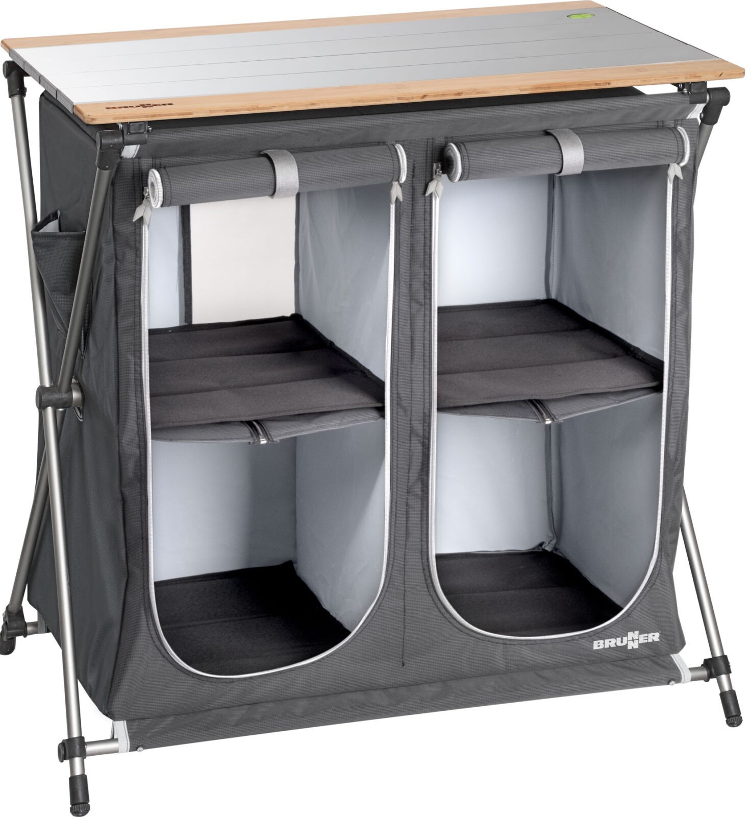 Aufbewahrungsmöbel Campermöbel ideal für Campingbusse und Kastenwagen;Praktisches Aufbewahrungsmöbel mit extrem kleinem Packmaß, sehr leichter Aluminiumstruktur und zentralem Metallgelenk. Alle Füße sind höhenverstellbar. Mit 4 Innenablagen und einer obenliegenden Arbeitsplatte aus Bambus/Alu. Mountless-System. Inklusive Tragetasche.