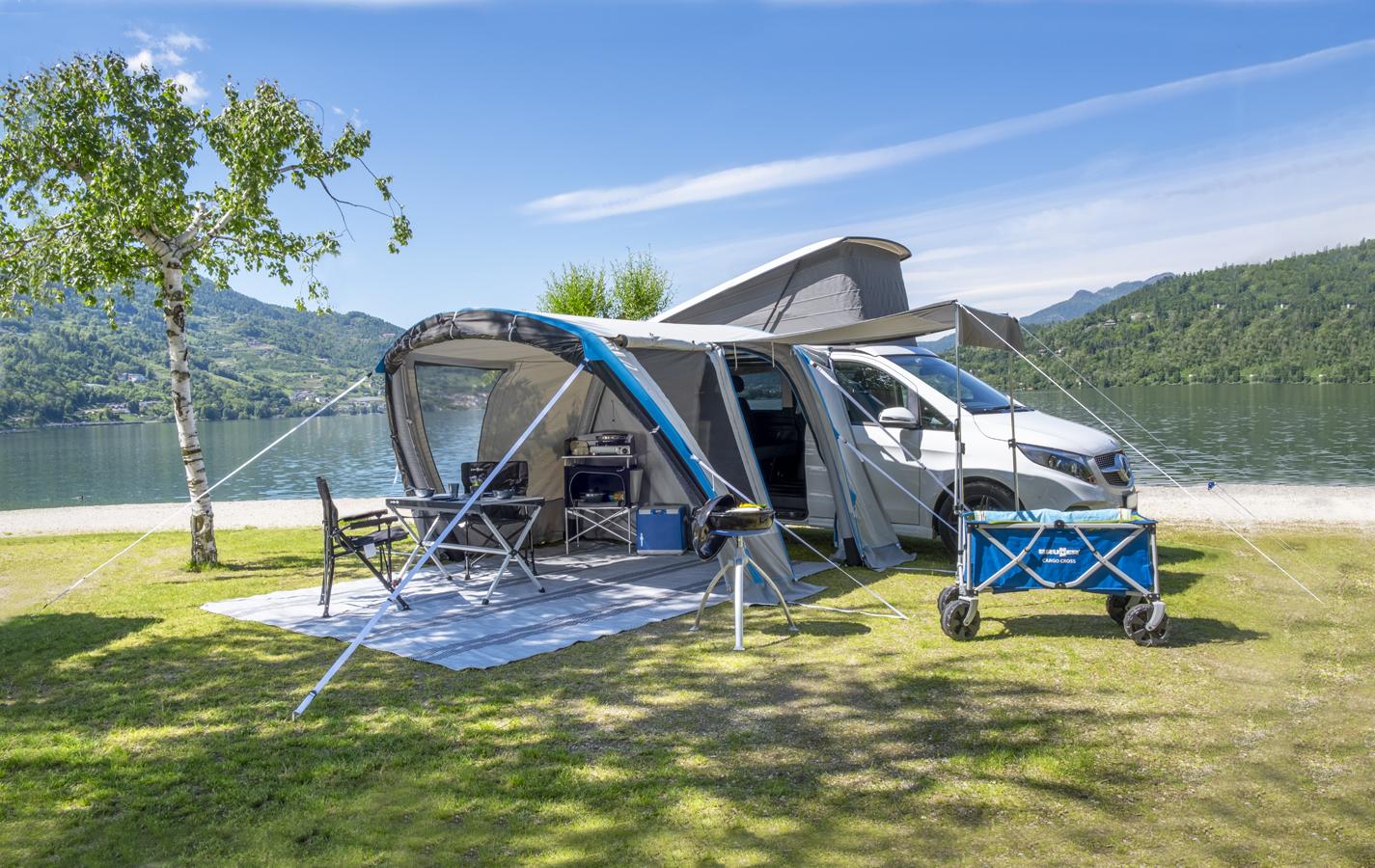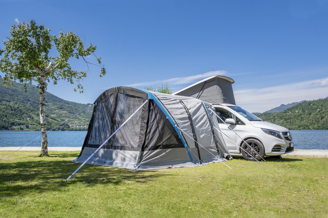 Das Vorzelt kann wahlweise mit einem 5/7 Keder angebracht werden, per Scheusenstab oder aber mit den schon angenähten Gurten und Clips an der Dachreling festgebunden werden. Abspannleinen, die über das Dach gespannt werden können, bieten zusätzliche Sicherheit.