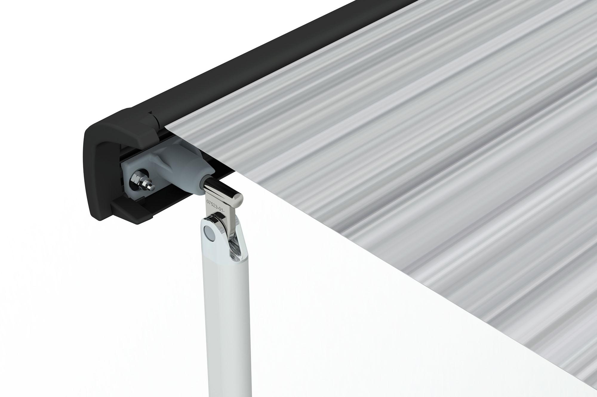 • Verstärkte Gelenkarme mit reduziertem Querschnitt, welche gerade herausfährt und die Frontblende dadurch minimal nach oben gestellt werden kann. Dadurch wird so das Öffnen und Schliessen der Schiebetür bei geöffneter Markise nicht beeinträchtigt