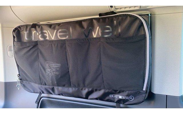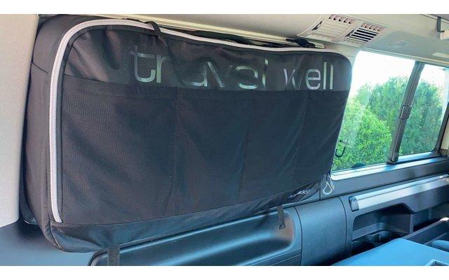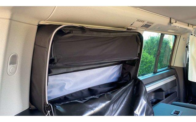 Die Fenstertaschen können wahlweise in das hintere Fenster der Fahrer- oder Beifahrerseite eingesetzt werden im VW T5 / T6 California Beach – Multivan (kurzer Radstand) mit Sonnenrollo.