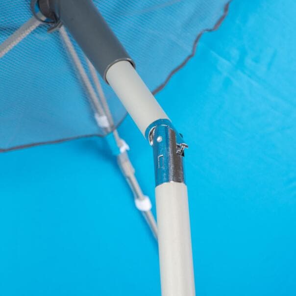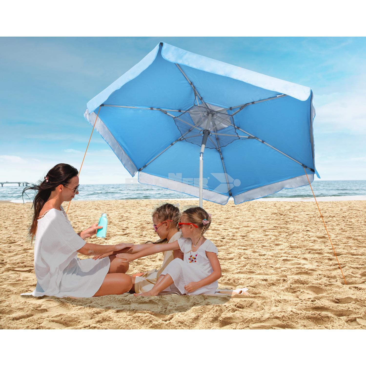 Moderner Strand und Sonnenschirm mit kompaktem Packmaß. Ausgestattet mit Aluminiumstiel und einem hochbelastbaren, UV-stabilen Schirmbezug. Zusätzliche Schlaufen an den Enden der Streben ermöglichen eine Abspannung gegen starken Wind. An der Unterseite des Sonnenschirms befinden sich 2 Haken und ein praktisches Netz für Utensilien. Durch die verstellbare Seitenneigung bietet der Schirm besten Sonnenschutz zu jeder Tageszeit. Inklusive Tragetasche.