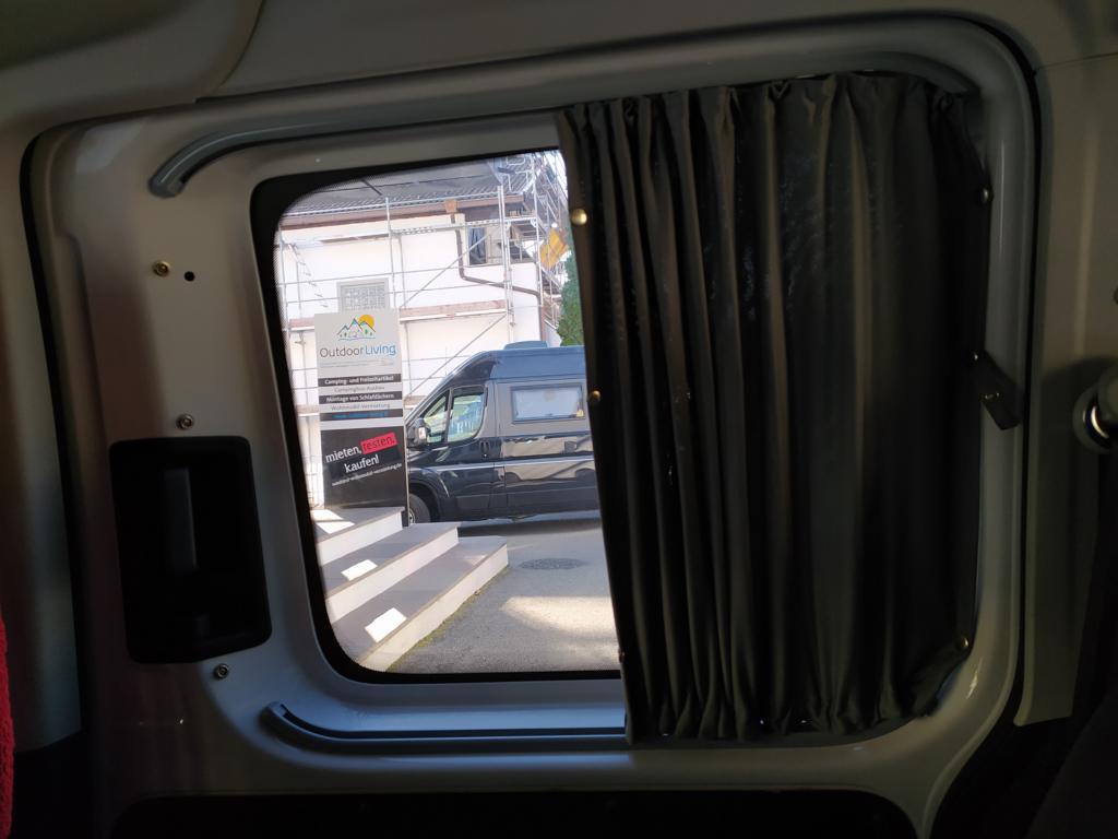 Die extrem hochwertigen Vorhänge VW Caddy sind bereits vormontiert und vorgebogen. Dadurch passen sie exakt in den Fensterrahmen und lassen sich schnell befestigen. Die doppelte Gardinenführung oben und unten garantiert eine perfekte Stoffspannung ohne Wellen oder Lichtspalten. So bleibt der Innenraum zuverlässig dunkel – ideal zum Schlafen, Umziehen oder für diskretes Campen im Van.