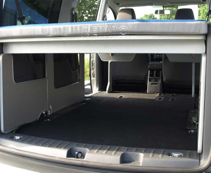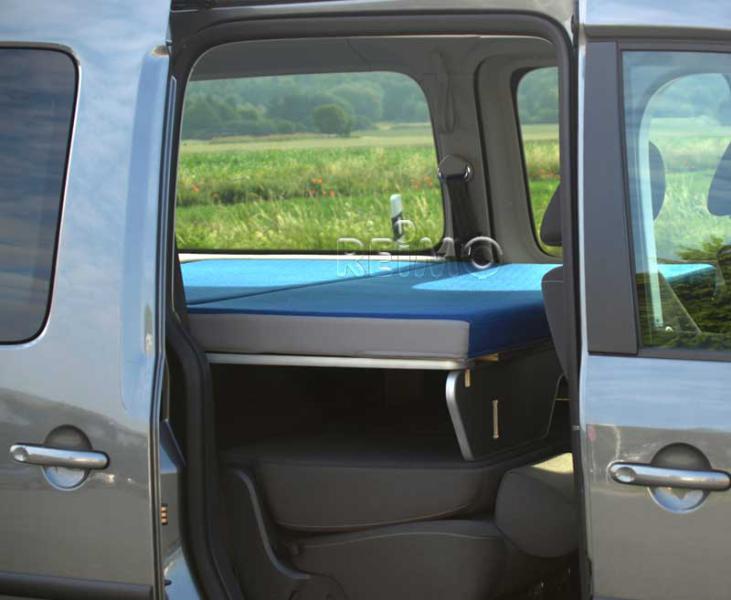 Für VW Caddy Maxi Kombi, langer Radstand. Mit seinem großen Bett für 2 Personen ideal auch für spontane Übernachtungen. Zum Einbau des Smile C Plus ist am Fahrzeug selbst keine Veränderung nötig. Für das Urlaubsgepäck ist unter dem Bett viel Platz. Das hinter der Rücksitzbank verstaute Bett kann beim Fünfsitzer immer eingebaut bleiben. Das Kofferraumvolumen bleibt erhalten. Im Handumdrehen entsteht eine absolut ebene, breite Liegefläche für 2 Personen: Die Lehnen der hinteren Sitzplätze werden einfach umgeklappt, die Bettplatte ausgezogen und die Polster darauf gelegt. Zwischen Bett und vorderen Sitzen bleibt weiterer Freiraum. Der komplette Ausbau ist mit wenigen Handgriffen ein- und ausgebaut. Der Ausbau ist kompakt zusammenklappbar und kann platzsparend verstaut werden. Als Zubehör steht ein Thermo-Mattenset zur Verdunkelung rundherum zur Verfügung. Alternativ stehen, ebenfalls als Zubehör, Gardinen in Gleitschienen für den Bettbereich zur Wahl.