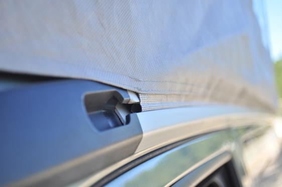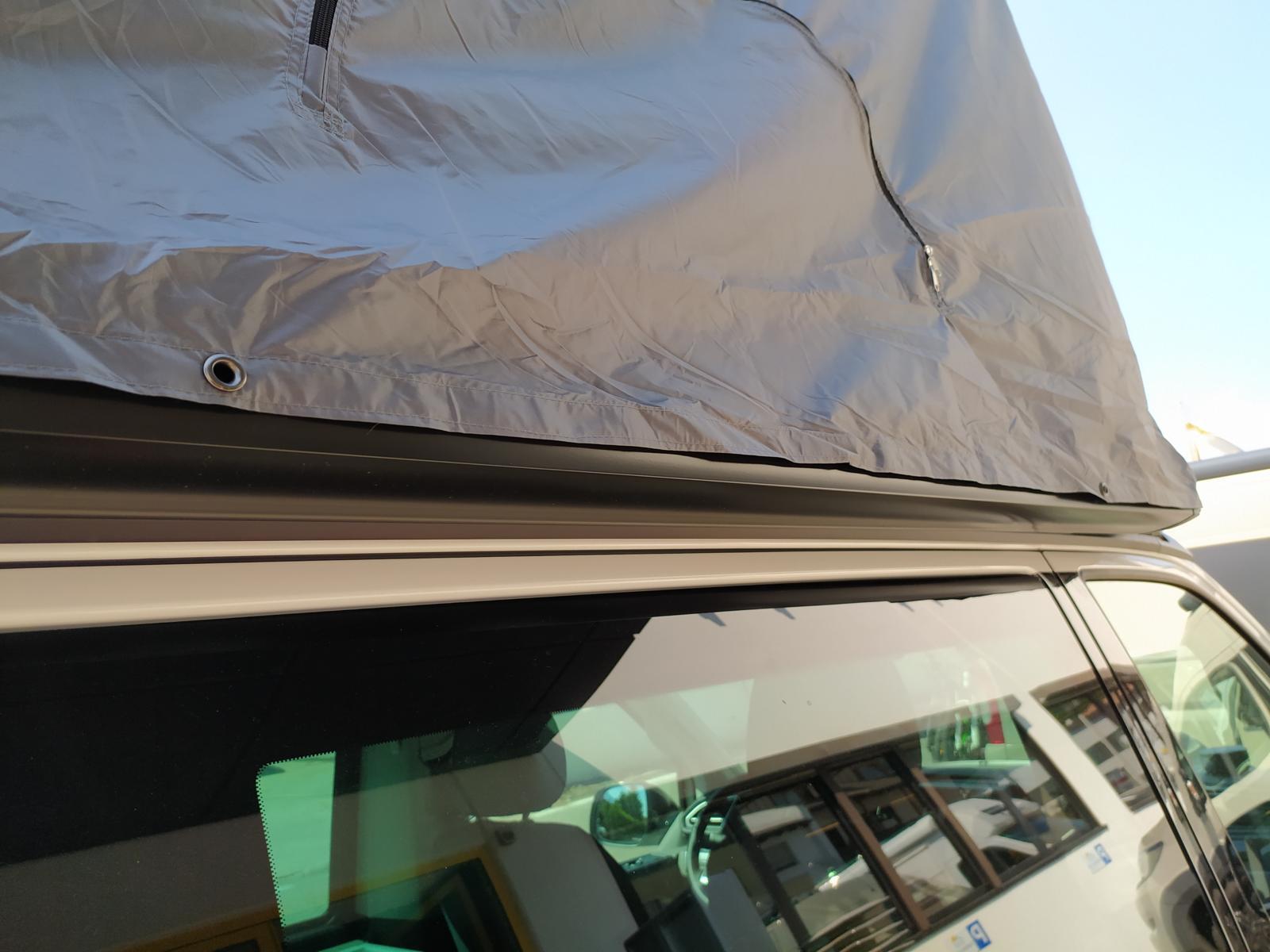 Die passgenaue Anbindung am Fahrzeug verhindert ein Einströmen von Aussen-Luft in den Zwischenraum von Mütze und Zeltbalg und die stehende Luft dahinter dämmt das Aufstelldach optimal gegen Kälte und Hitze.