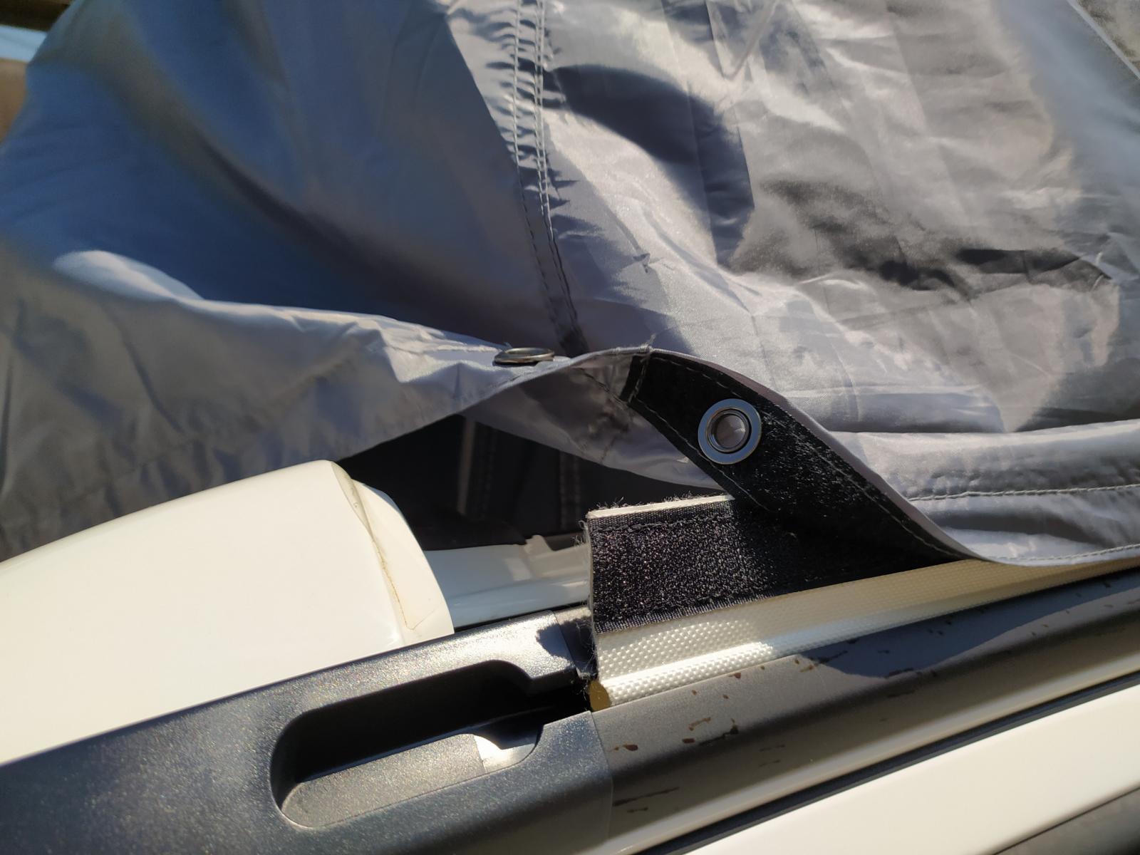 Befestigung beidseitig mittels Einzugkeder, der in die vorhandene Schiene eingezogen wird, außerdem befinden sich mehrere Ringösen an der Haube; so kann diese auch an die bestehende Markise befestigt werden oder in Verbindung mit einem Sonnensegel (Sonnensegel-Adapter erforderlich, optional). Keine Saugnäpfe erforderlich, kann dank Ringösen zusätzlich verspannt werden.