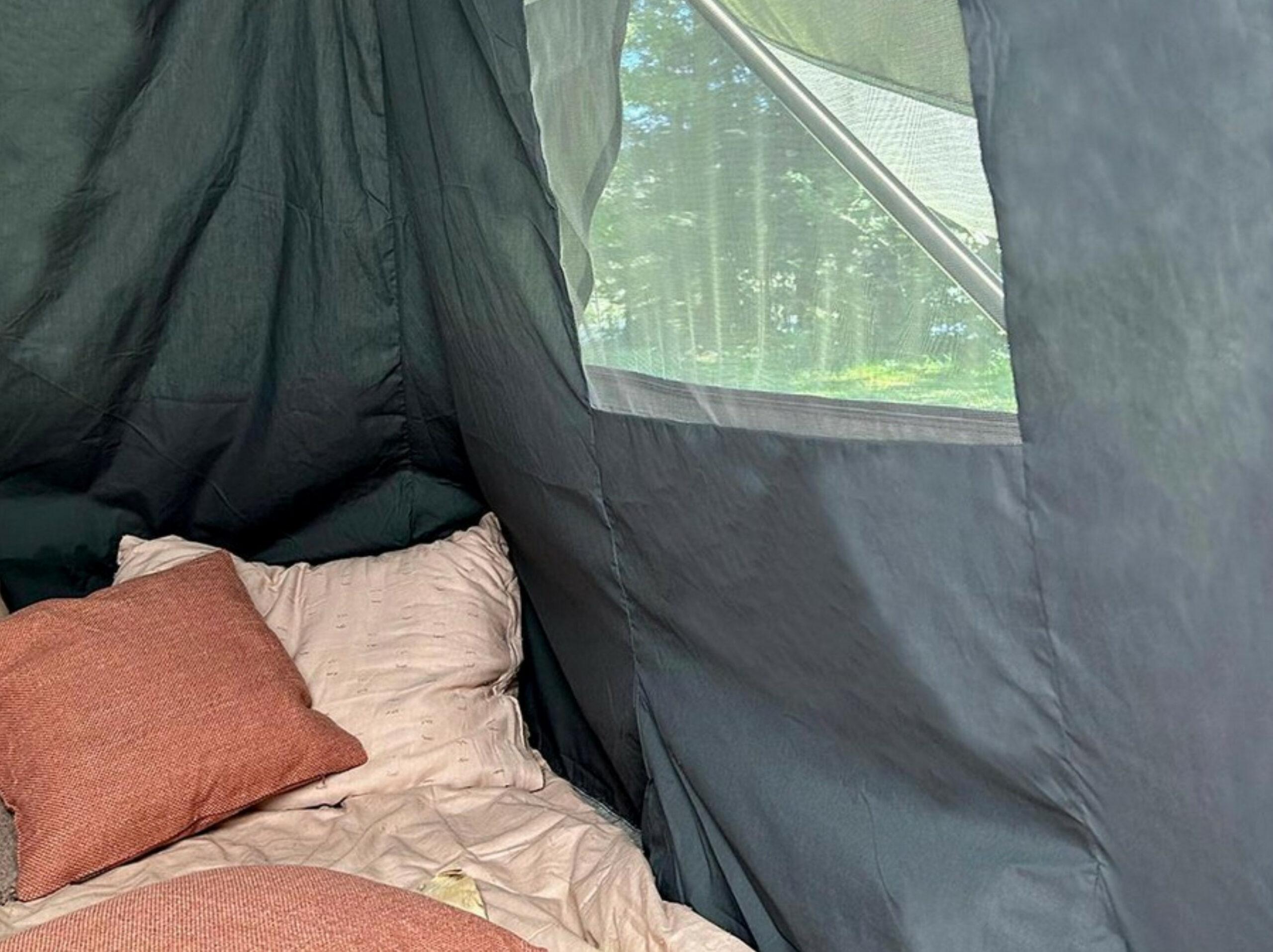 Der Camp-let Earth verfügt über verdunkelte Schlafkabinen mit einer Belüftung auf beiden Seiten. Dadurch bietet er optimale Schlafbedingungen für einen komfortablen und erholsamen Schlaf beim Campen mitten in der Natur.