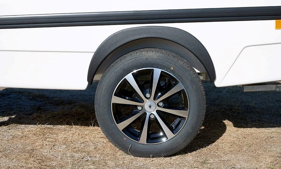 Komplett geschlossene GFK-Schale, Alu-Felgen, Gute Belüftung durch Moskitogaze in der Front, in beiden Seitenteilen und an den Schlafkabinen (mit Außenöffnung), Küche rechts aus dem Zelt herausschwenkbar, integrierte Verdunklung, abgedunkelte Schlafkabinen, dunkle Matratzen;