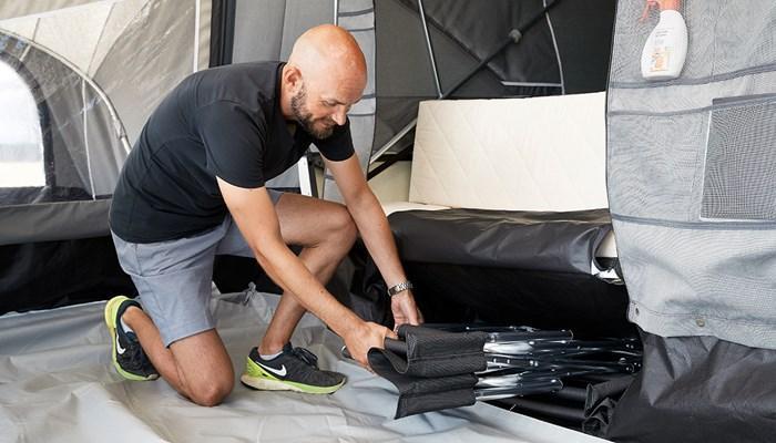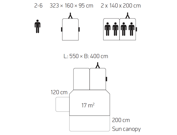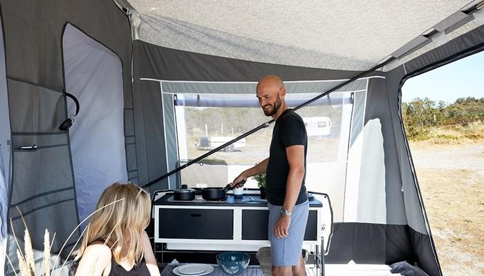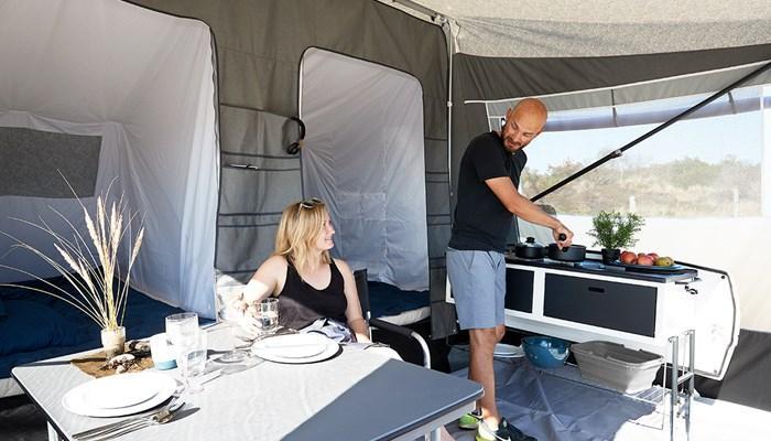 Sie reisen mit mehr als 4 Personen? Kein Problem. Im Camp-let North wird es Ihnen niemals zu eng werden. Bauen Sie einfach eine Gästekabine an, ein Sonnensegel oder ein beiseitig verwendbares Seiten- und Frontteil.