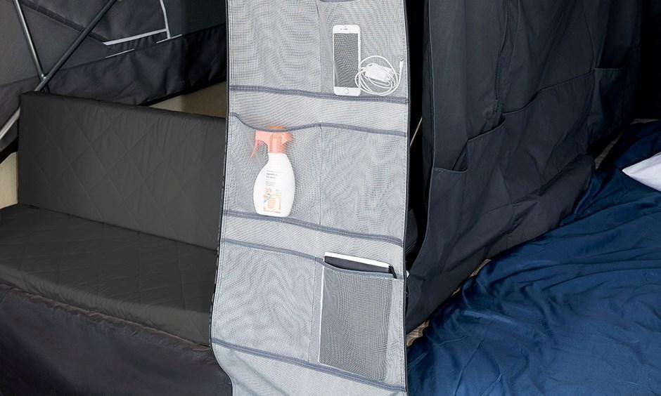 Serienmäßige Lieferung mit: Kabinenblende mit Stautaschen (Netz), geschlossenem Staufach unter dem Hänger, zusätzlichem direktem Zugang zur Lagerung unter dem Hänger, eine Verandastange, abgedunkelte Schlafkabinen, dunkle Matratzen, integrierte Gardinen, Garderobenstange und Alu-Räder schwarz-silber.