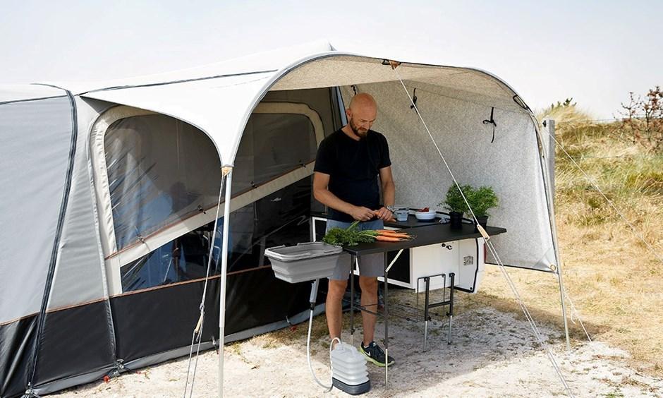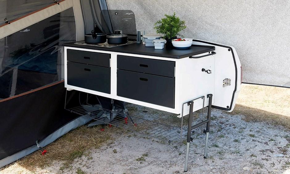 Der Passion hat 2 Küchen zur Auswahl (Allround oder Deluxe), die gegen Aufpreis hinzubestellt werden können (Auswahl oben rechts). Beide Küchen sind sehr luxoriös, mit großer Arbeitsplatte, Staufächer bzw. Schubladen für Geschirr, Besteck und Töpfe. Die Küche kann ebenfalls durch 180° Drehung ausserhalb des Zeltanhängers verwendet werden, unter dem praktischen, als Zubehör erhältlichen Sonnensegels Passion! Ausserdem ist die Küche auch bei zugeklapptem Camp-Let zugänglich, z.B. während einer Pause auf der Reise.